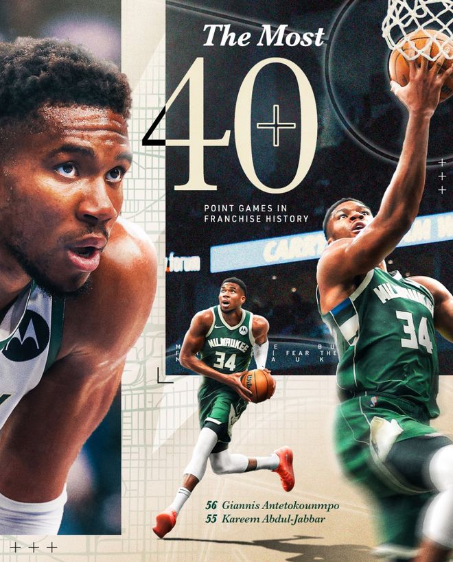 2.雄鹿队史56次40+超过贾巴尔成为队史第一人;