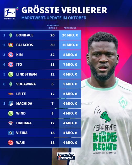 身价腰斩!德甲身价跌幅排行榜:博尼法斯下跌2000万欧居首